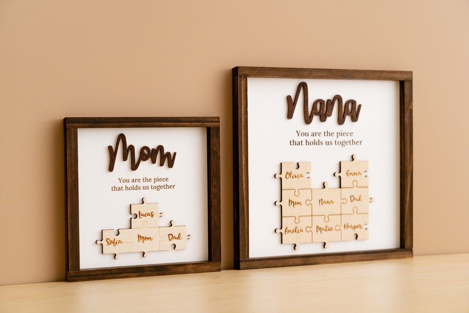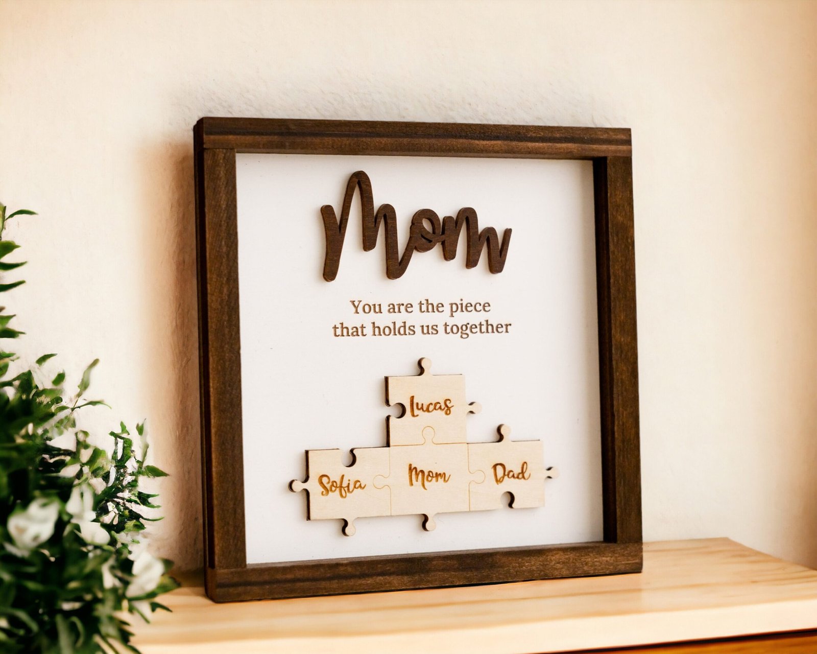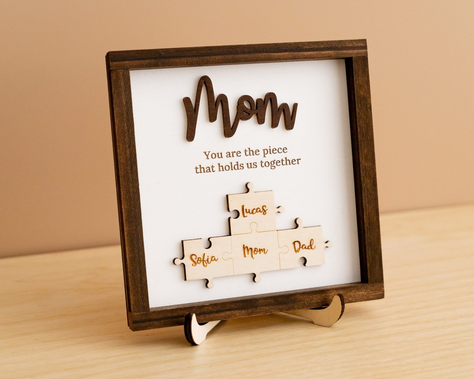 - 💬 Heartfelt Engraved Message The touching phrase “You are the piece that holds us together” is deeply engraved on the faux shiplap background, adding a meaningful layer of emotion to the overall design.